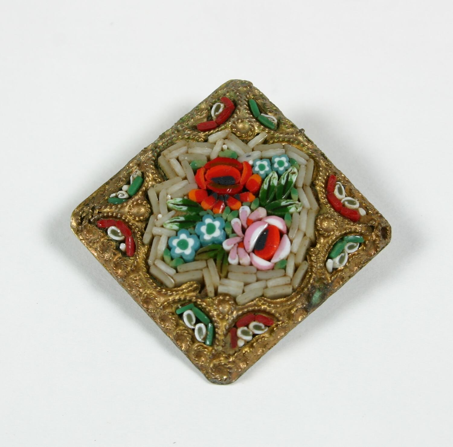 Moulded square diamond shaped metal brooch inset with a plastic, possibly celluloid, floral design on the obverse. The brass-coloured metal is moulded with decorative designs around the red, pink, orange, green, blue, white and off-white coloured plastics of the floral design. A metal pin and pin enclosure is attached on the reverse. Engraved text appears on the reverse. The brooch is tarnished and soiled. Spots of green patina appear on both sides of the brooch.