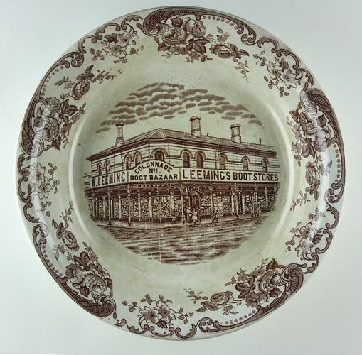 Decorated shallow bowl with broad rim, monochrome transfer printed decoration in brown. Crazing in the glaze but limited associated staining. Design features decorative floral border around rim, and image of a Victorian corner shop building with arched windows and a cast iron veranda (Leeming's Boot Store) in the centre. There are small figures visible standing in front of the shop, and numerous pairs of shoes displayed in the shop windows.