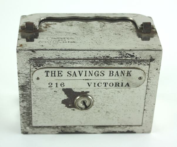 Engraved on front plate: "THE SAVINGS BANK / 216 VICTORIA". Stamped on top: "W. F. BURNS CO. / CHICAGO / PATENT APPLIED FOR". Stamped on left: "PAPER" Stamped on right: "COIN".
