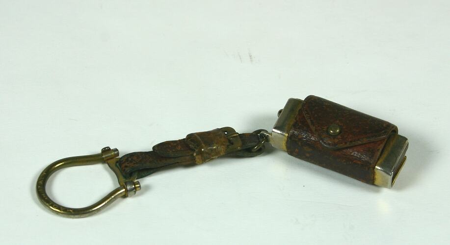 Miniature harmonica consisting of a timber comb, metal reed plates and metal coverplates. Engraved text appears on the cover plates on the obverse and reverse. There is a metal eyelet attached at the end of the mouth organ. The case for the mouth organ is made of a metal frame and a piece of leather which folds over the top of of the harmonica and is secured by a buttonhole. A leather strap with a metal buckle and a metal eyelet is attached to the case. The harmonica is soiled, dented, tarnished and has rust on some parts. The leather case is soiled. The leather is worn and the metal parts are tarnished. There is a green patina on parts of the metal frame, eyelet and some patina has rubbed onto the leather strap. Tape is wound around the buckle on the leather strap.