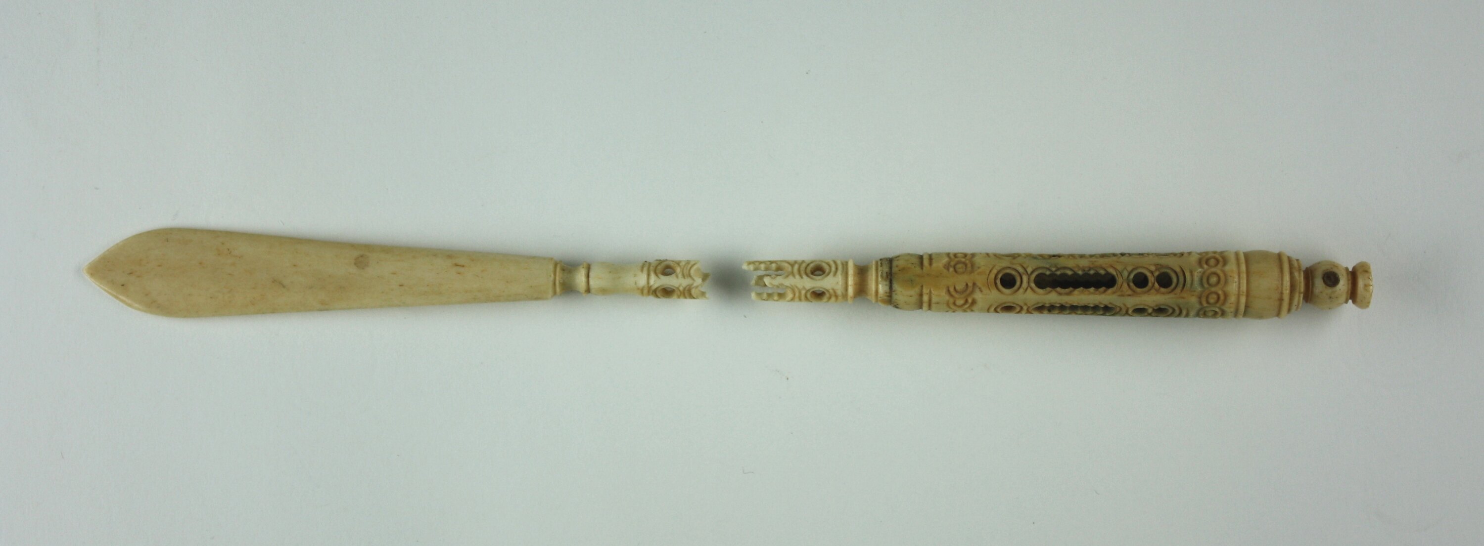 Carved ivory letter opener, broken into two pieces at narrowest point. The handle is hollow and ornately carved with circular patterns.