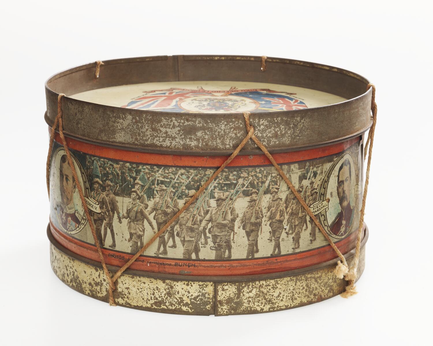 Toy drum dating from World War I, with front showing a map of Australia and the Read's store in Prahran. The reverse with the flags of the Allied powers. The drum depicting military scenes and portraits of King George V, Field Marshalls Earl Kitchener and Sir John French.