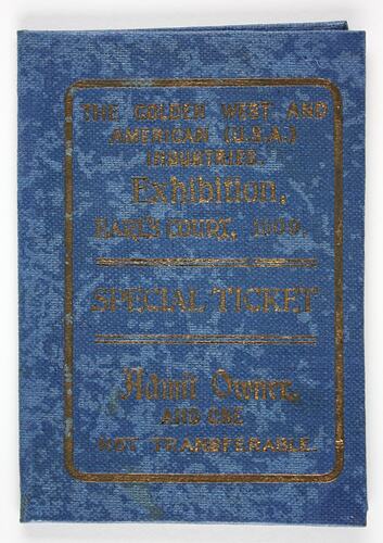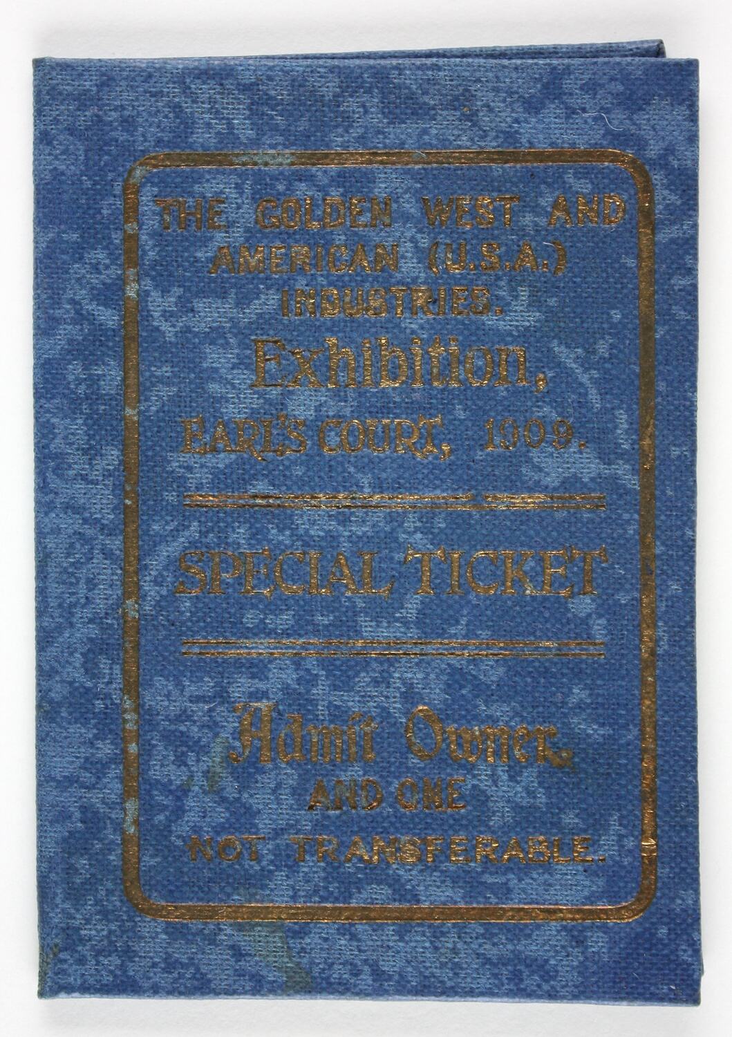 Front, embossed in gold: " THE GOLDEN WEST AND AMERICAN (U.S.A.) INDUSTRIES / Exhibition. / EARL'S COURT, 1909 / SPECIAL TICKET / Admit Owner AND ONE / NOT TRANSFERABLE." Back, embossed in gold: THE LONDON EXHIBITIONS LTD. / 1909." Extentive printed and handwritten text within: "THE GOLDEN WEST & AMERICAN (U.S.A.) INDUSTRIES EXHIBITION 1909. / EARLS COURT S.W. / SPECIAL Season Ticket (For Two Persons.) / Name and Address: (Handwritten) Hon J. W (?). Hackett LLD (?) & One / By Order of the Board / THE LONDON EXHIBITIONS LTD. NO. 3778" and extensive further text.