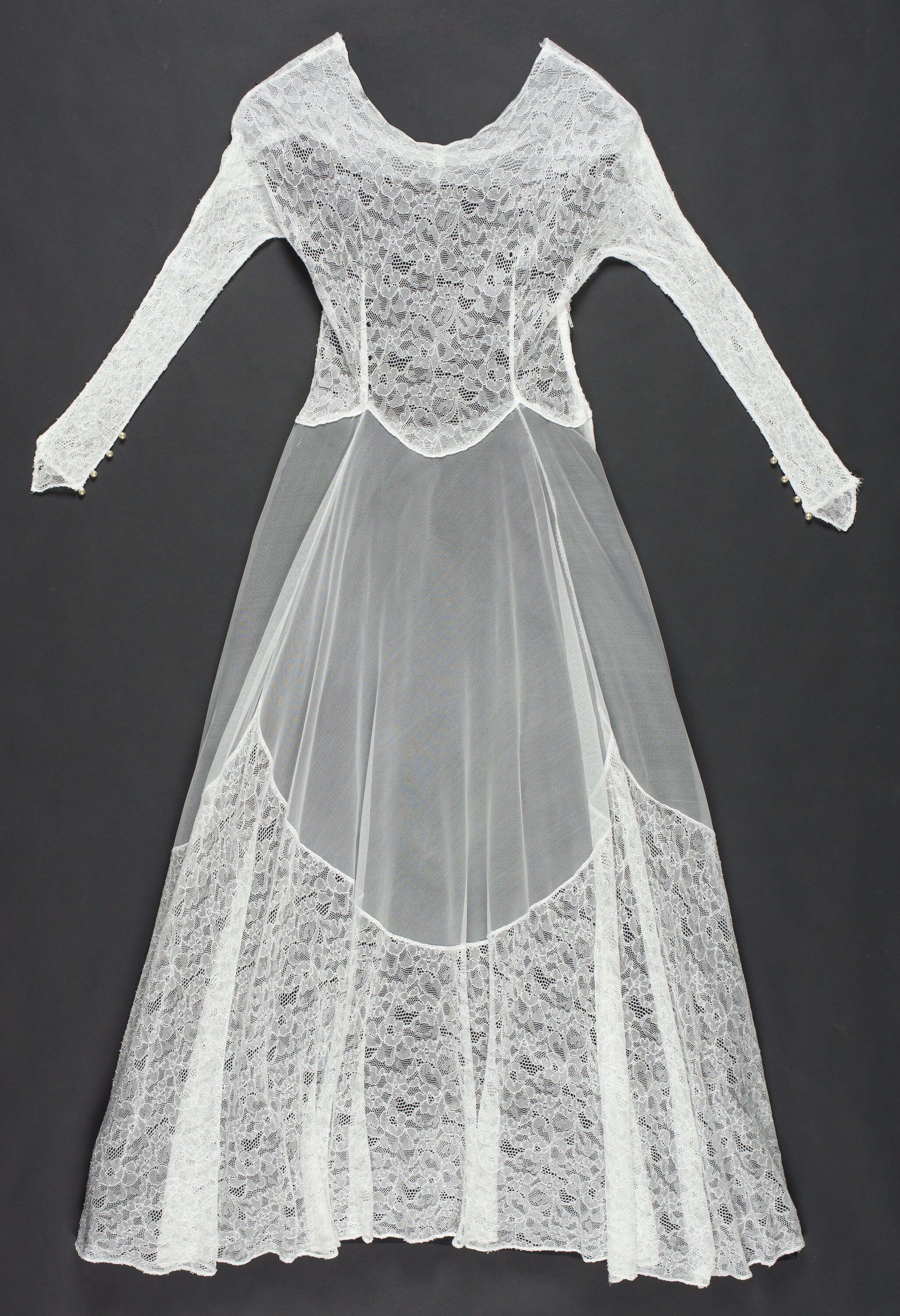White wedding dress made to fit a tiny female frame. It has a scoop scalloped neckline with long fine lace sleeves and 4 pearl buttons at each wrist. Also row of 13 pearl buttons in a row down the back and a white zip down the right hand side. The bodice is of fine floral pattern lace as are the sleeves. The skirt is in fine sheer net finished at three-quarter length and finished with the fine floral lace. The skirt flares out and hem tapers out to a point, longer at the back than the front.