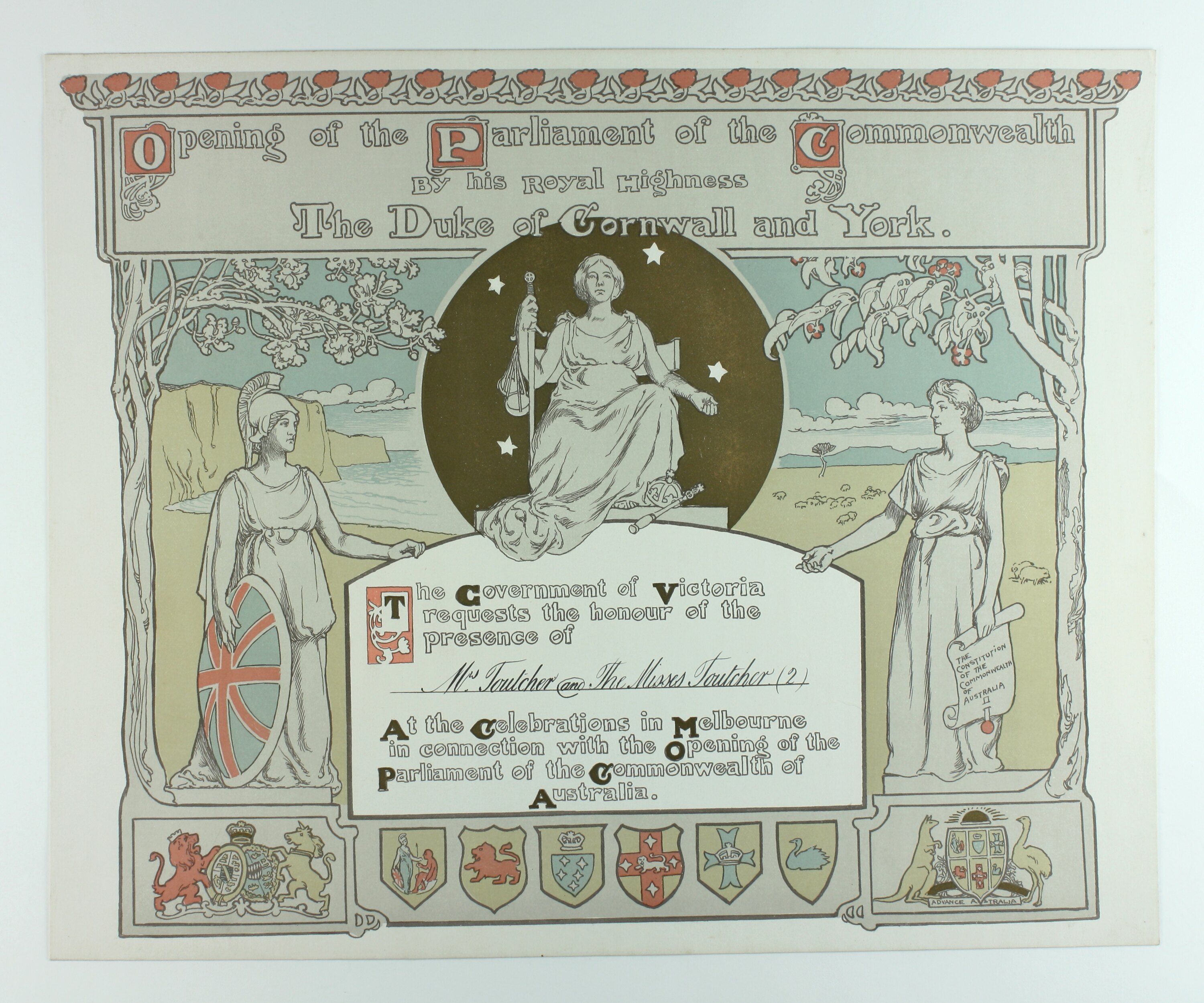 Front, printed. gold ink: "Opening of the Parliament of the Commonwealth By his Royal Highness The Duke of Cornwall and York / The Government of Victoria requests the honour of the presence of / Mrs Toutcher and The Misses Toutcher (2) (handwritten / At the Celebrations in Melbourne in connection with the Opening of the Parliament of the Commonwealth of Australia."