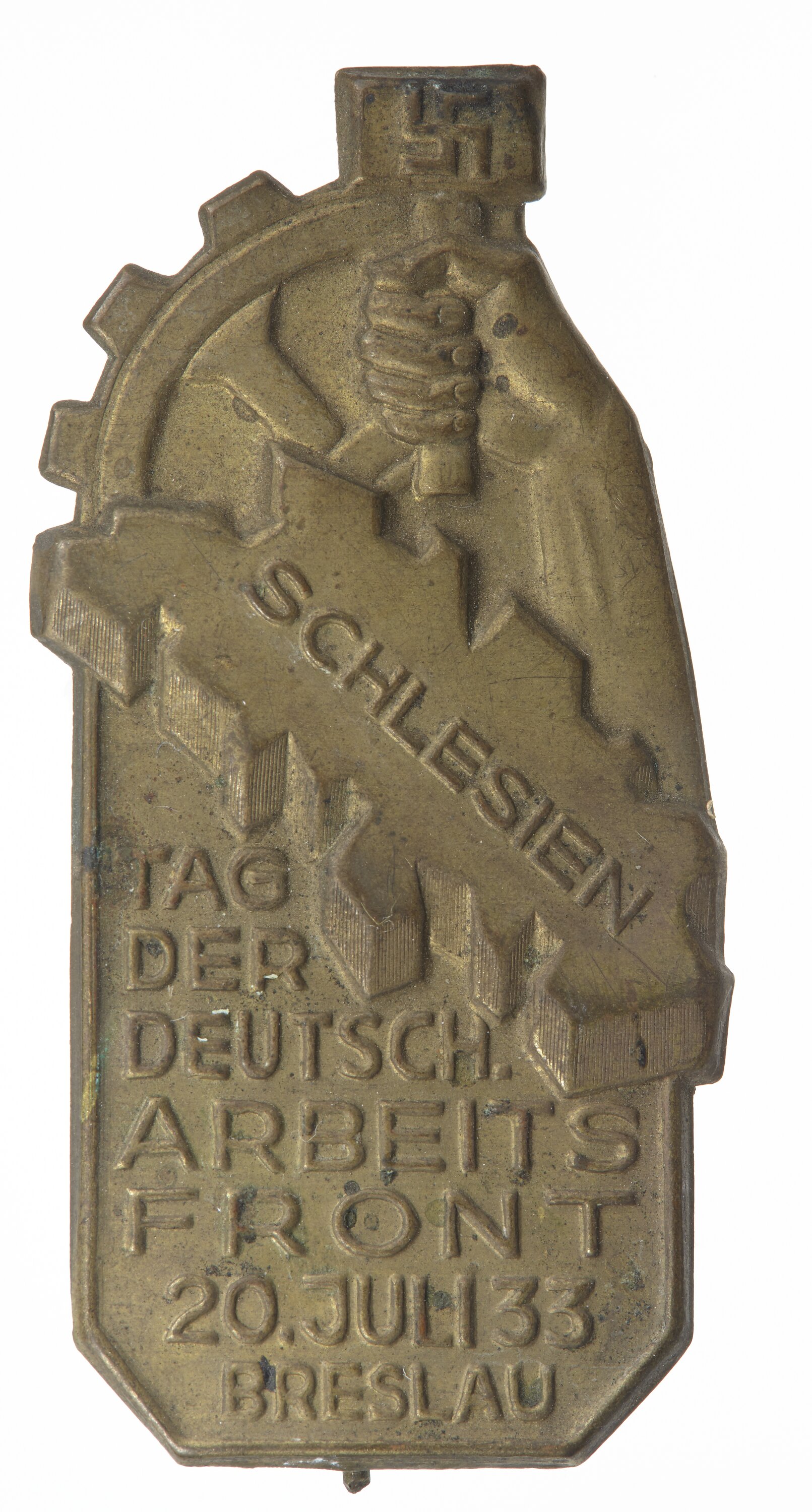 Uniface brass badge with pin on back. At top right, NSBO logo , with a hand holding a hammer with a swastika. At top left is part of a cogged wheel. In the centre is a stylized map.