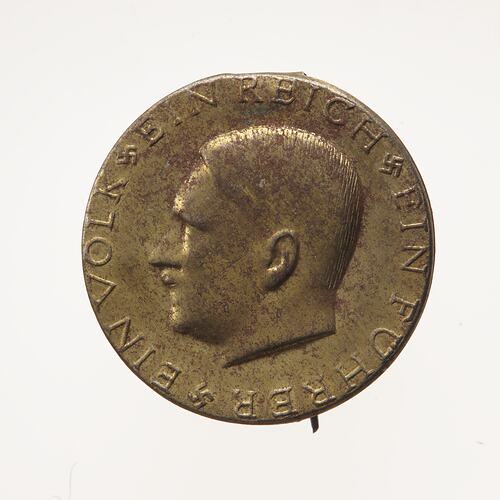 Badge depicting the profile of Adolf Hitler, Germany, circa 1933 (AD). In 1933 Hitler became Chancellor of Germany. The badge may have been part of an election campaign.