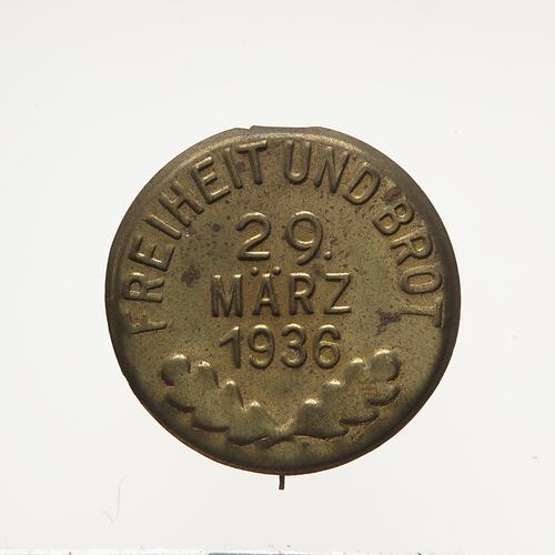 Pin, Freedom and Bread, Germany, 29 March 1936. The United States Holocuast Museum describes their object as follows: 'Political campaign pin from the Reichstag election in Germany on March 29, 1936. The Nazi Party was the only party on the ballot. The pin features the slogan "Freedom and bread," which the Nazi Party had used during its rise to power.'