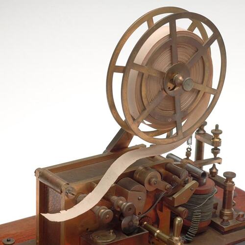 Early demonstration system comprising Morse key, code tape embosser, and a Gray's Harmonic Telegraph (?), all mounted on a wooden base board, with the embosser and harmonic telegraph enclosed in a glass sided cover. An early Museum label affixed to this unit gave 1858 as the date. This is remotely possible, but the harmonic telegraph dates to 1881. The embosser is marked "W. Myers maker Melbourne". The wooden base board is not finished in a way which suggests a commercial provenance (e.g. the cutout of the hole for the embosser). There are 4 brass screw terminals. The embosser appears to be half the normal scale, although it is standard half-inch paper tape used in it. Probably at least part-made in Australia about the middle of the 19th century.