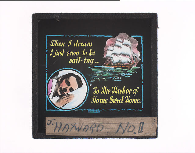 Printed on glass: 'When I dream/I just seem to be/sail-ing/To The Harbor of/Home Sweet Home/Pickford Slides'. Handwritten on tape: 'J. HAYWARD / NO. 0'.