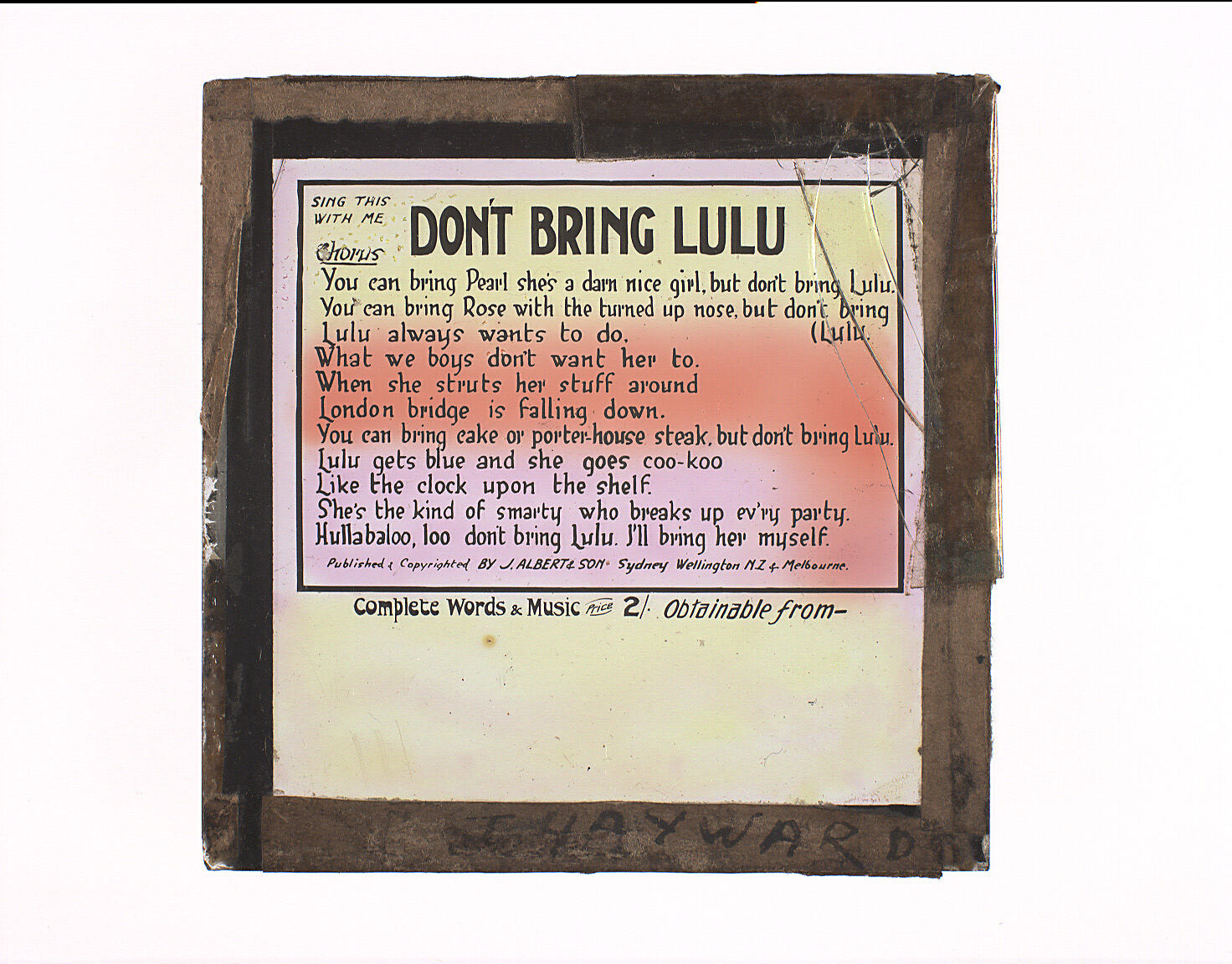 Printed on glass: 'SING THIS/WITH ME/DON'T BRING LULU/Chorus/You can bring Pearl she's a darn nice girl but don't bring Lulu', followed by ten more lines and publisher's information.'Published & Copyrighted by J. ALBERT & SON'.