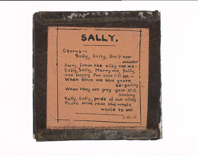 Lantern Slide with the song lyrics for 'Sally'. Lyrics and music by Will E. Haines, Harry Leon & Leo Towers. The song, from the 1931 film 'Sally in Our Alley', is usually associated with English singer and actor Gracie Fields.