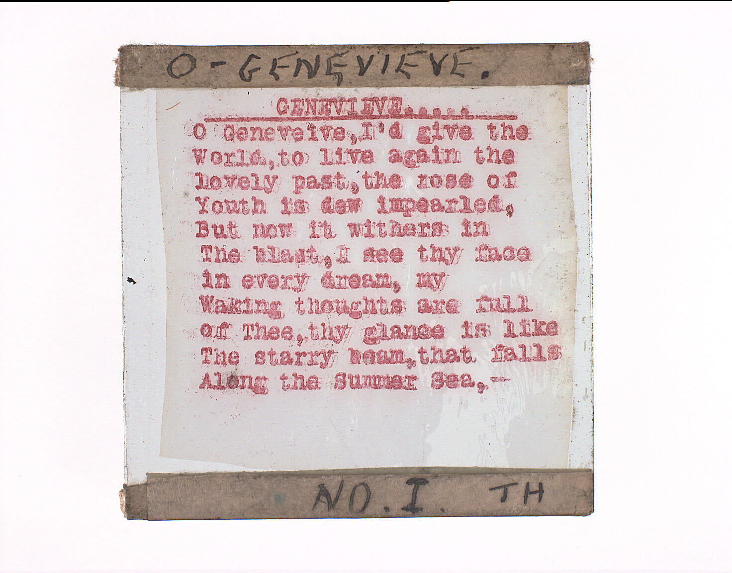 Printed on glass in red typescript: 'GENEVIEVE/O Geneveive [sic], I'd give the/World, to live again the/lovely past' followed by eight more lines. handwritten on tape: 'O GENEVIEVE / NO. I . JH'