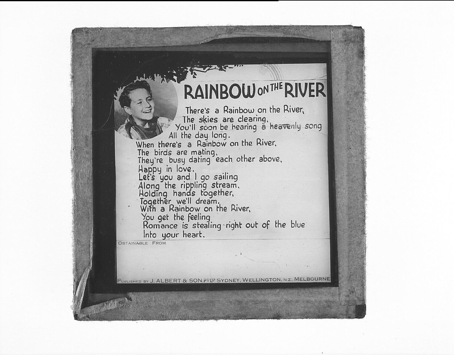 Printed on glass: "RAINBOW ON THE RIVER/There's a Rainbow on the River/The skies are clearing/You'll soon be hearing a heavenly song/All the day long' followed by twelve more lines. At lower edge: 'PUBLISHED BY J. ALBERT & SON PTY LTD SYDNEY , WELLINGTON, N.Z. MELBOURNE'