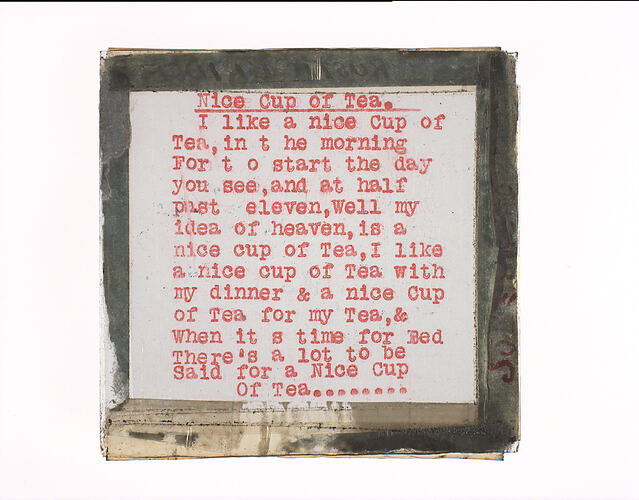 Printed on glass in red typescript:' Nice Cup of Tea/I like a nice Cup of/Tea', in the morning followed by twelve more lines. Illegible handwriting on tape.