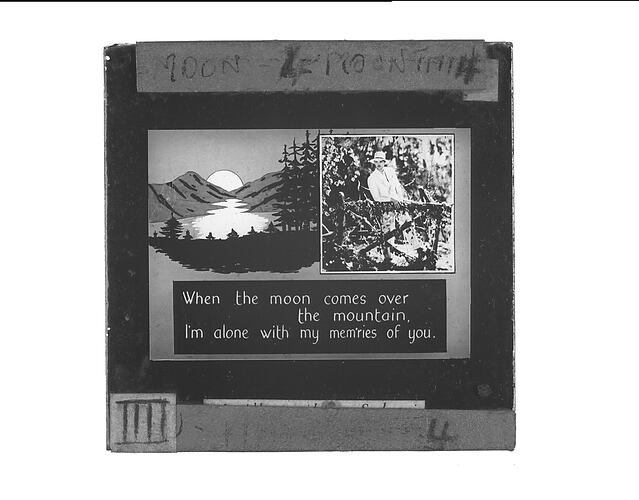 Lantern Slide with the song lyrics 'When the Moon Comes Over the Mountain' Part 4. Lyrics written by Howard E. Johnson, and music by Harry M. Woods, circa 1931.