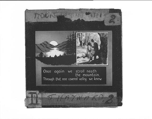 Printed on glass: 'Once again we stroll neath/the mountain/Through that rose covered valley we knew'. Handwritten on tape: 'MOON MOUNTAIN 2. / II J. HAYWARD . 2 [overwritten on 3]'.