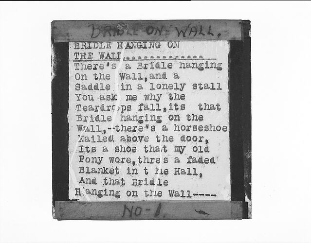 Lantern Slide with the song lyrics for 'Bridle on the Wall' Part 1.