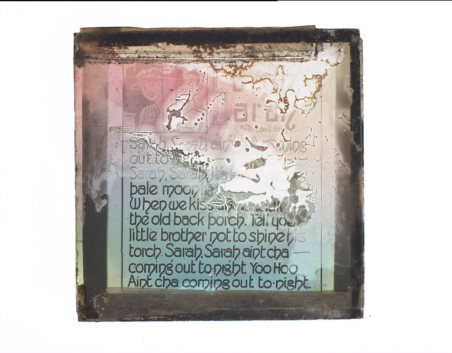Prijnted on glass: 'Sarah / Sarah/ Chappell Song / Sarah, Sarah ain;t [you co]ming out tonight' followed by eight more lines.