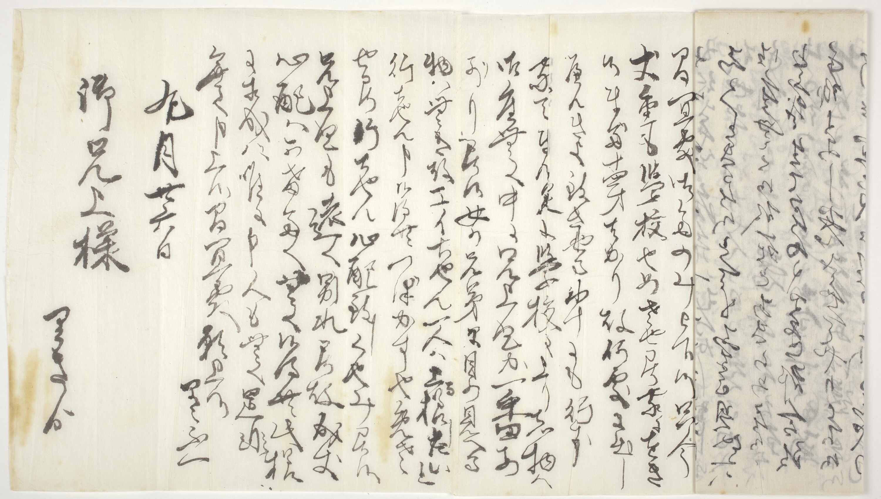 Long format rice paper letter with several folds. One side is filled with handwritten Japanese text.