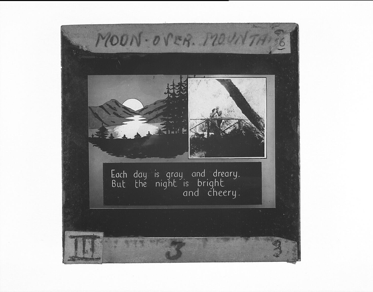 Lantern Slide with the song lyrics 'When the Moon Comes Over the Mountain' Part 3. Lyrics written by Howard E. Johnson, and music by Harry M. Woods, circa 1931.