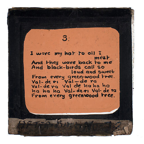 Lantern Slide with the song lyrics for 'The Happy Wanderer' Part 3. English lyrics written by Antonia Ridge.