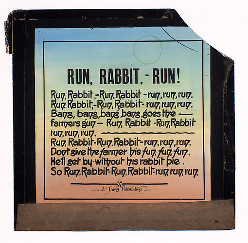 Lantern Slide with the song lyrics for 'Run, Rabbit, Run'. Music by Noel Gay and lyrics by Ralph Butler, 1939. The song was originally sung by Flanagan and Allen. It was popular during World War II, and used to make fun of the enemy. It was published by Davis.