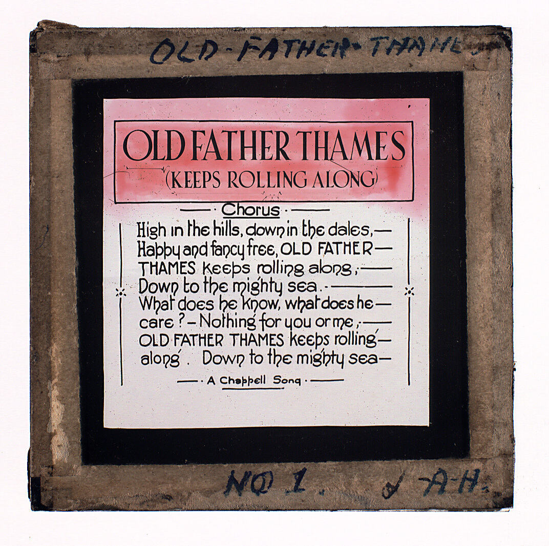 Lantern Slide with the song lyrics for 'Old Father Thames' Part 1. Lyrics and music by Raymond Wallace and Betsy O'Hogan, 1933. Published by Chappell.