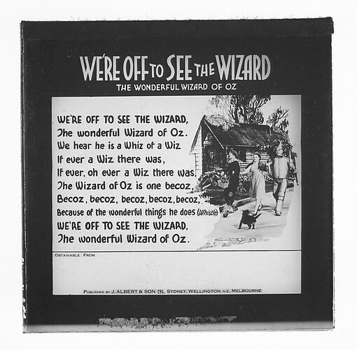 Lantern Slide with the song lyrics for 'We're Off to See the Wizard', slide has an illustration from the 1939 film 'The Wizard of Oz'. Lyrics written by E. Y. "Yip" Harburg. Published by J. Albert & Son.