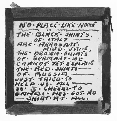 Lantern Slide with the song lyrics for 'No Place Like Home'. This is one of the few overtly political lantern slides in this collection, referring to the Black Shirts of Italy, the Brown Shirts of Germany, the Red Shirts of Russia and Mahatma Gandhi.