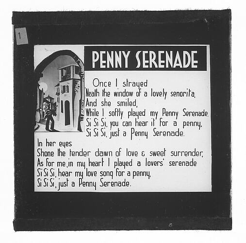 Lantern Slide with the song lyrics for 'Penny Serenade' Part 1. Published by J. Albert & Son, Sydney & Melbourne.