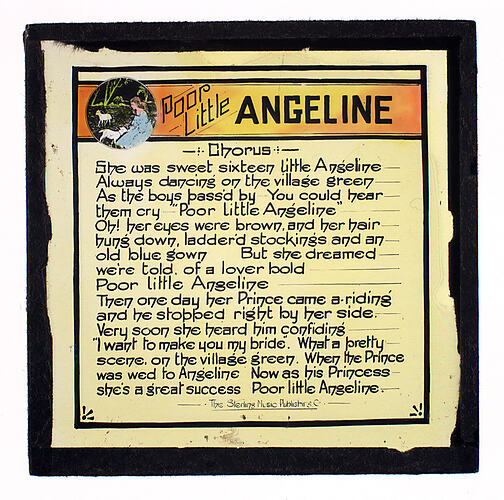 Printed on glass: ' Poor/Little/ANGELINE/Chorus/She was sweet sixteen Little Angeline/Always dancing on the village green', followed by fourteen more lines. 'The Sterling Music Publishing Co.'