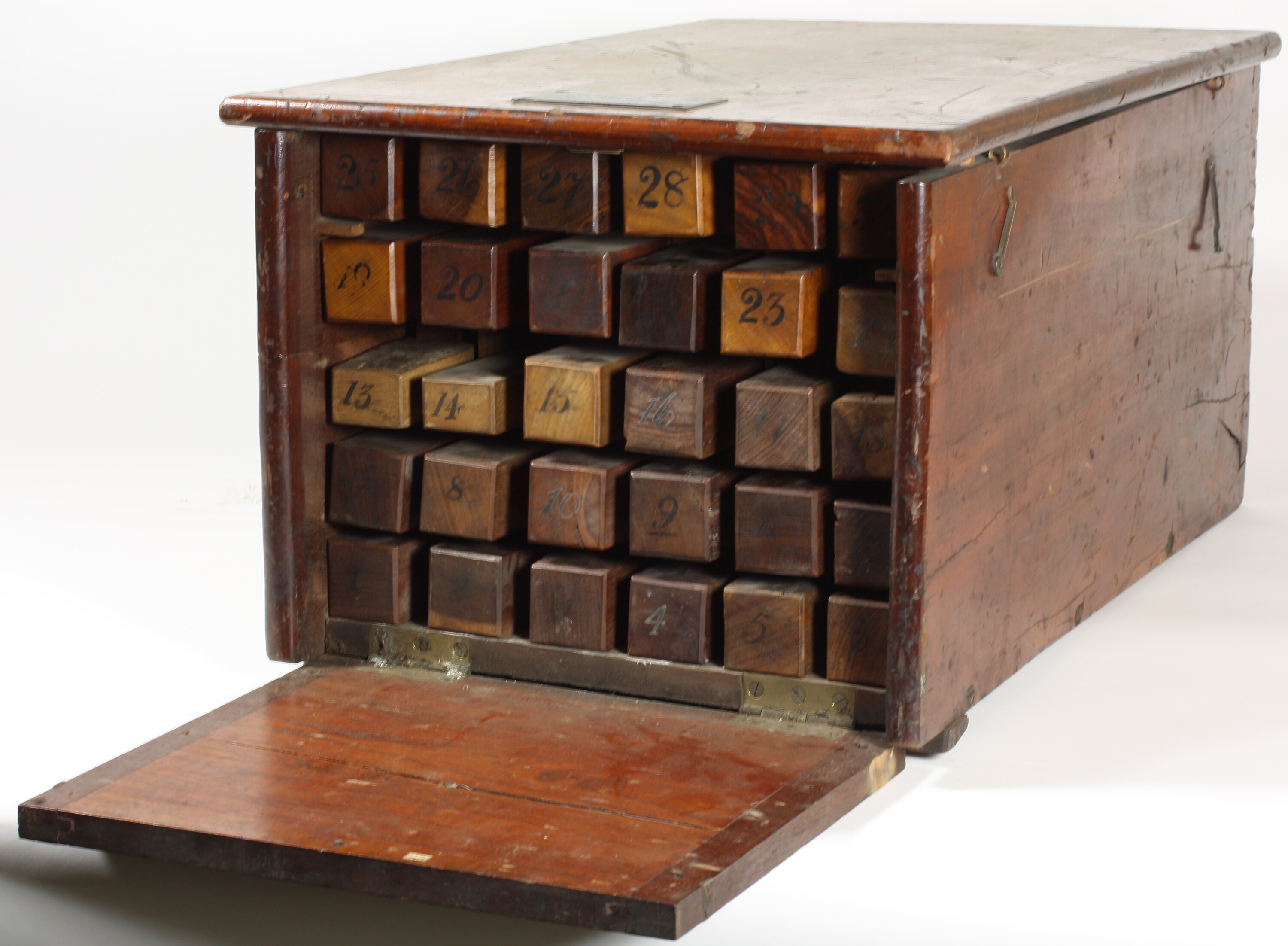 Box of Australian timber samples exhibited by John Cuthbert, Ship Builder of Sydney in the New South Wales Court at the 1866 Intercolonial Exhibition in Melbourne. The box contains 30 timber samples from blue gum, northern red gum, southern red gum, water gum, southern spotted gum, northern spotted gum, iron bark, black butt, blood wood, bang ally, iron bark (40 years in use), stringy bark, mangrove, colonial beech, colonial pine, mahogany (27 years in water), swamp mahogany, swamp oak, kauri pine, cedar, forest mahogany, myall, white honeysuckle, red honeysuckle, bean tree, white tea-tree, tulip and native pear tree.