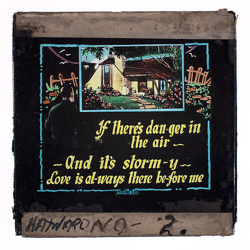 Printed on glass: 'If there's dan-ger in/the air/And it's storm-y/Love is al-ways there be-fore me/ Pickford Slides'. Handwritten on tape: HAYWARD -NO. - 2