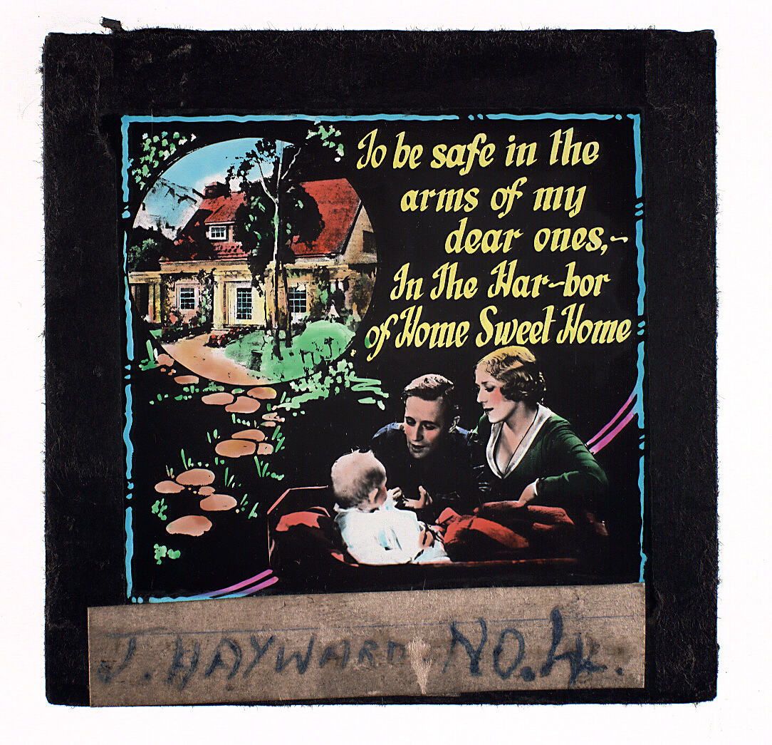 Printed on glass: 'To be safe in the/arms of my/dear ones/In the Har-bor/of Home Sweet Home. Handwritten on tape: 'J. HAYWARD NO. 4'