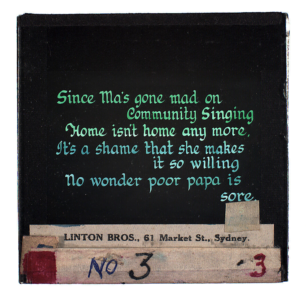 Lantern Slide with the song lyrics for 'Since Ma's Gone Mad on Community Singing', Part 3. Made by Linton Bros., 61 Market Square, Sydney.