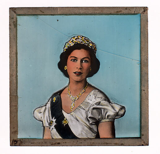 Lantern slide with an image of HRH Queen Elizabeth II. It was possibly used during the playing or singing of the National Anthem before each concert.
