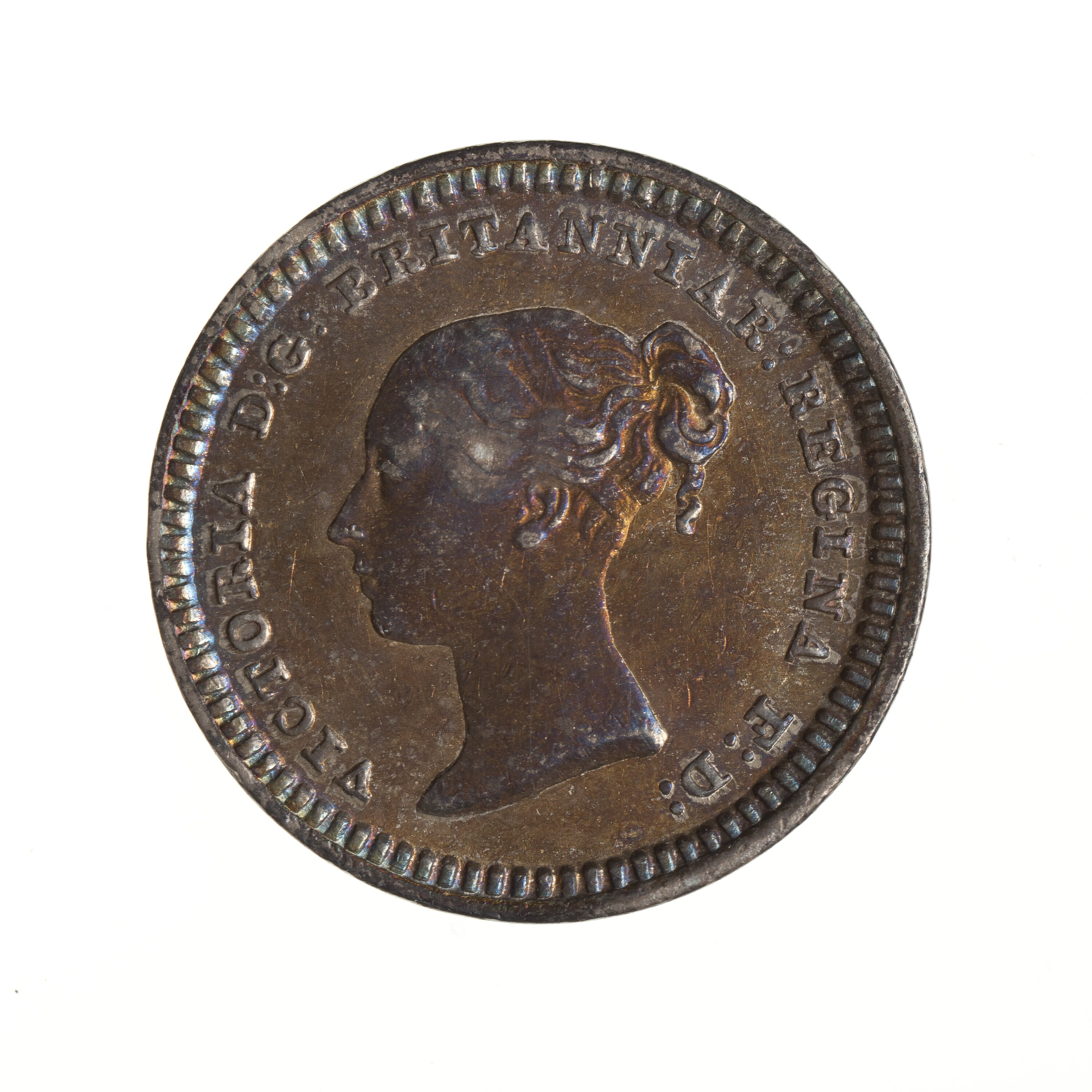 Head of the Queen facing left with plain band and fillet around hair; around, VICTORIA D:G: BRITANNIAR: REGINA F:D: