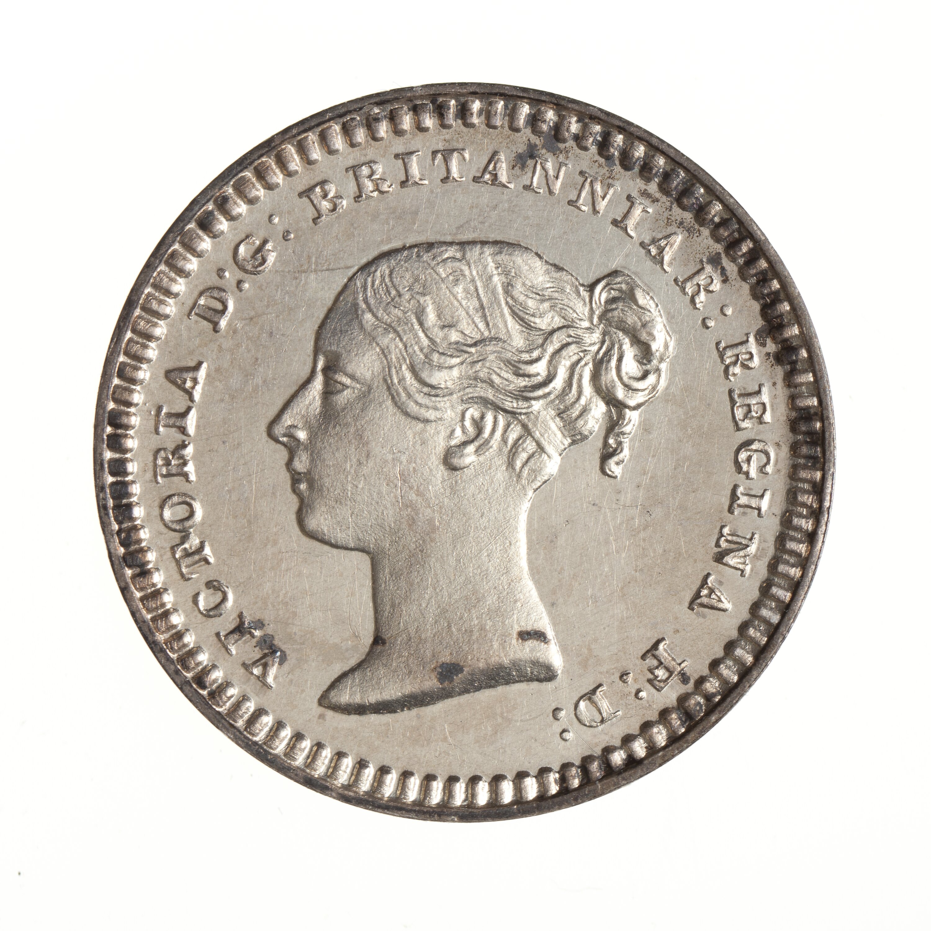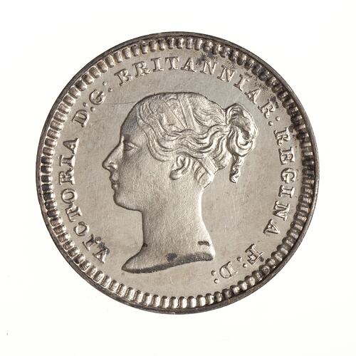 Head of the Queen with plain band an fillet around hair; around, VICTORIA D:G: BRITANNIAR: REGINA F:D: