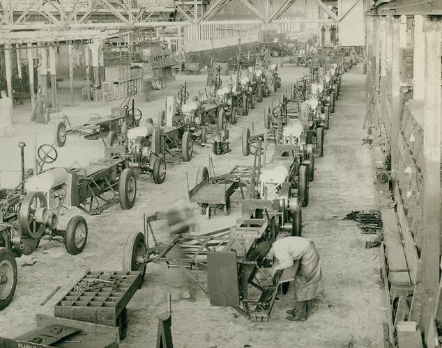 Part of a collection of photographs, moving film, artefacts, documents and trade literature relating to Massey Ferguson (Aust.) Ltd and its predecessors. The Australian operations of this company were originally founded by Hugh V. McKay, at Ballarat, in the late 1880s, and by 1895 was operating as the Sunshine Harvester Works. After relocating to Braybrook Junction (later renamed 'Sunshine') on the western outskirts of Melbourne, during 1904-1907, the business rapidly developed into the largest agricultural implement works in the southern hemisphere. In 1930, H.V. McKay merged with the Australian operations of the Canadian firm, Massey Harris Ltd, of Toronto, becoming H.V. McKay Massey Harris Pty Ltd. In 1955, this company was fully absorbed into the growing multinational corporation that became Massey Ferguson Ltd in 1958.
