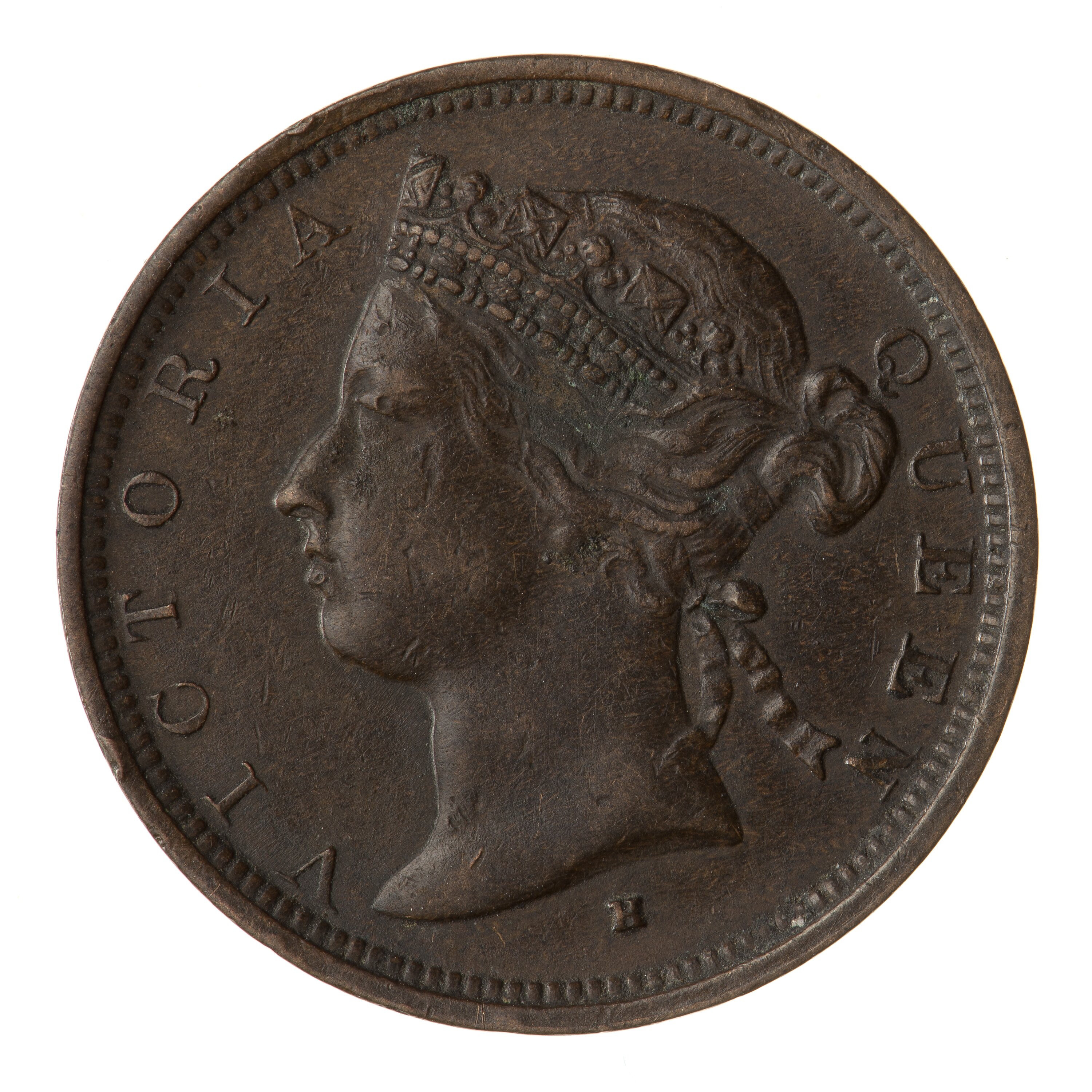 Diademed head of the queen facing left; around VICTORIA QUEEN; mint mark, H, below neck