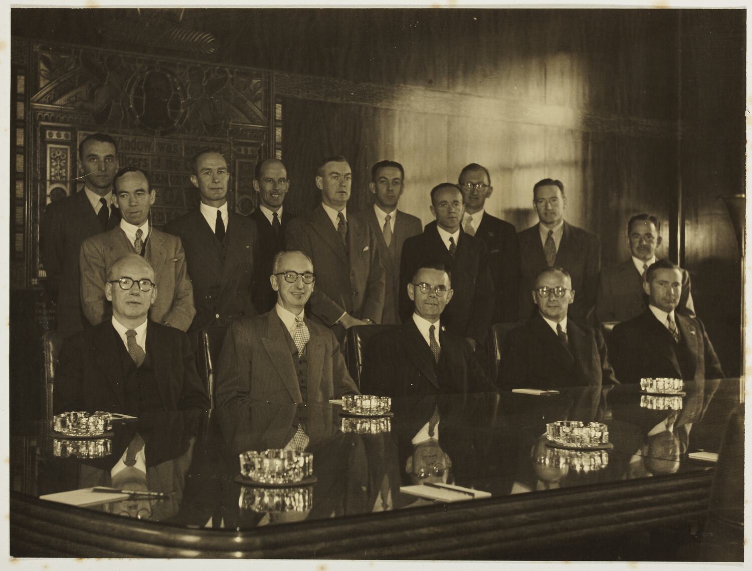 Members attending the first council meeting of the Actuarial Society of Australasia. Features group of 15 men, five seated at a long board table, the others standing in a row behind them. There is a key to identify men below the photograph. George Palmer seated front row second from left.