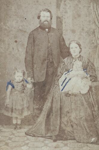 Monochrome digital photograph of Janet Scrimgeour, Peter Brackelmann and two of their three children, taken in Bendigo, circa 1869.