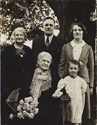 Family portrait of three or four generations of the Scrimgeour, Crocker, Davies family in a garden setting. An elderly woman is seated in a chair in the centre of the photograph, she holds the hand of a young girl who stands next to her, behind the girl stands a young woman (possibly her mother), next to the young woman, and directly behind the seated elderly woman, stands a man and next to him stands an older woman.