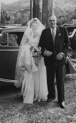 Portrait of Elsa Crocker Lewis with her father, Selby. They are in an outdoor setting, with a wedding car behind them. Elsa wears her wedding dress and holds a bouquet, Selby is dressed in a suit.