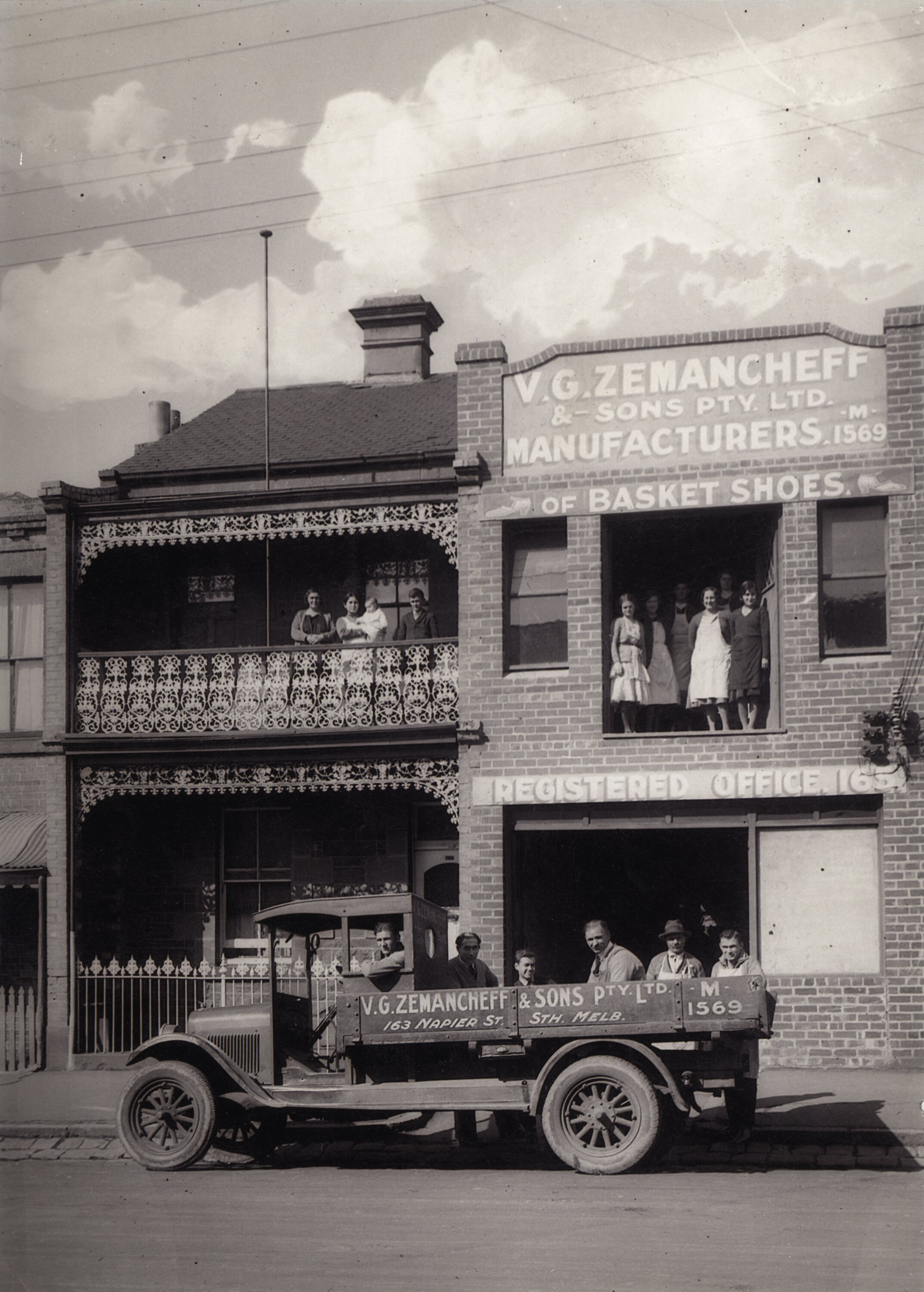 Stanio Ivanoff Fancoff was born in 1908 in Bojentsi, a small village in Bulgaria. At age 11, Stanio left home to learn the shoemaking trade. In 1929, he immigrated to Melbourne, settled in Fitzroy and began to work for the V.G. Zemancheff & Sons basket shoe factory in South Melbourne. In 1936, he married Dorotea Georgi Touzou who had recently arrived in Australia. Around this time, Stanio set up his own shoemaking business from home, with Georgi, her cousin and sister weaving the shoes which he then assembled. Selected shoe samples were then taken to Sydney and Tasmania for sale. In 1942, Georgi and Stanio moved to Broken Hill for Georgi's health; daughter Nancy was born there and Stanio set up a shoe shop/factory. In 1945, Georgi died and by 1950 Stanio and Nancy had moved to Adelaide where he again opened a shoemaking business and shop. He passed away in 1978, having been in the shoemaking business for 59 years.