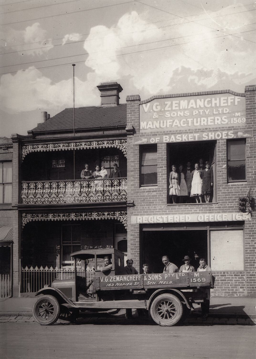 Black and white photograph of workers outside V.G. Zemancheff & Sons basket shoe factory in South Melbourne, Melbourne in 1931.