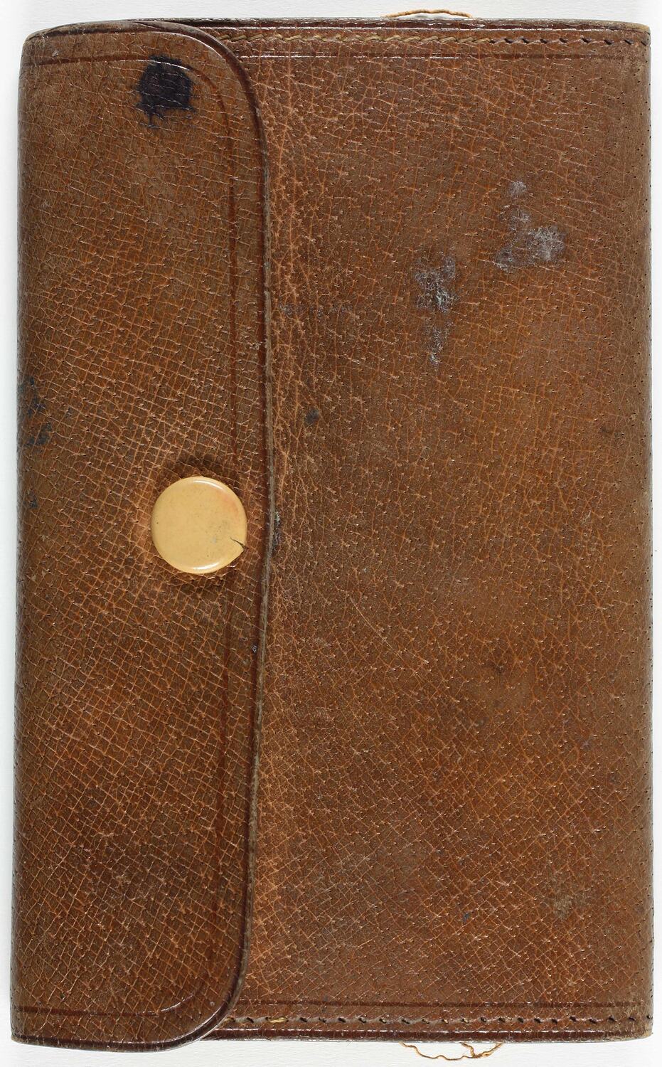 Brown leather wallet with machine stitching and beige coloured button.There are pockets inside for holding cash and other documents. There is an inscription written in pencil on the inside flap with the owner's name and address and the year the wallet was received (presumably).