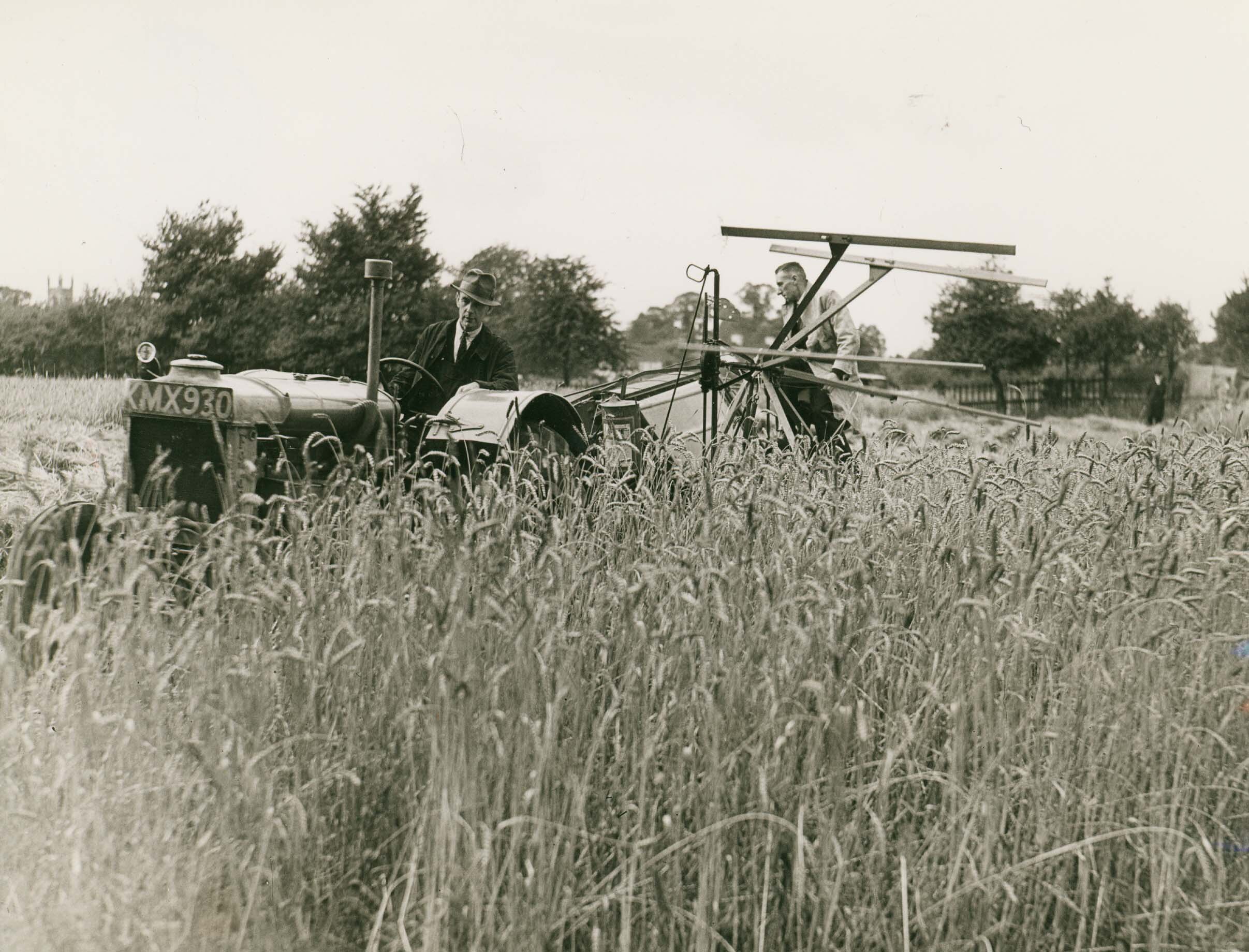 Blue circular ink stamp on back, 'J.B.Caoul, London WC2, Aldwych Aldywch House' Purple ink stamp on back, 'THE COPYRIGHT OF THIS PHOTOGRAPH / IS THE PROPERTY OF "THE FARMER / & STOCK BREEDER" DORSET HOUSE / STAMFORD STREET, LONDON, SE 1, / REPRODUCTION IS FREELY ALLOWED / PROVIDED THE WORDS "FARMER & / STOCK BREEDER" ARE CLEARLY RE- / PRODUCED UNDER THE BLOCK ITSELF, /.....[ILLEGIBLE]' Black type on back, 'A HEAVY CROP OF "SQUARE HEAD MASTER" WHEAT / being cut by "Sunshine" No.6B Reaper & Binder. / Estimated yield: 8/10 quarters to the acre. / This is the first "Sunshine" Binder imported / into the United Kingdom from Australia in the 1940 / and its third harvest at Bushley Park, Hampton / Court. / 18th AUGUST. 1942'