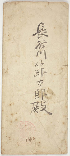 Envelope addressed to Setsutaro Hasegawa from the Japanese Consulate in Melbourne. The letter contained in the envelope is also in the collection (HT 22203). Setsutaro migrated to Australia from Japan in 1897 at the age of 26, just four years before the introduction of the Immigration Restriction Act which severely limited migration to Australia from countries in Asia. He established a laundry business in Geelong and by 1911 he had married an Australian-born woman and had three children.